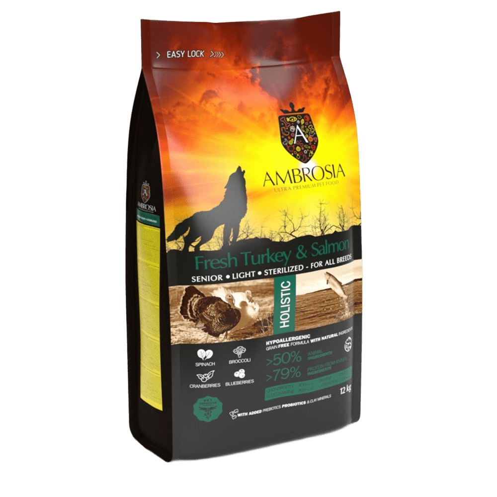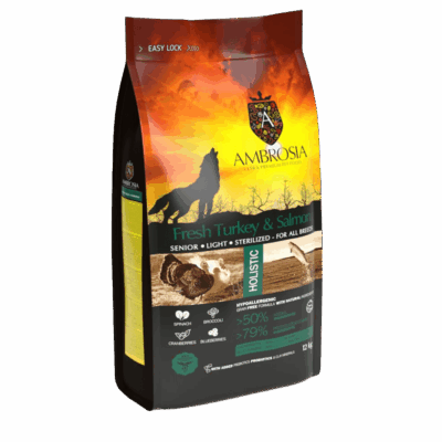 מזון הכלבים אמברוסיה הוא מזון הוליסטי, היפואלרגני וללא דגנים, המספק תזונה מאוזנת ובריאה לכלבים. אמברוסיה סיניור/לייט בטעם הודו טרי וסלמון הוא מזון יבש הוליסטי לכלבים מבוגרים, לכלבים עם נטייה לעודף משקל ולכלבים לאחר עיקור/סירוס. הפורמולה נטולת דגנים והיפואלרגנית, עם רמות שומן מותאמות ובשילוב אומגה 3 ו-6 לתמיכה בעור, בפרווה ובחיוניות הכללית. התערובת כוללת גם רכיבים צמחיים ונוגדי חמצון, ובנוסף גלוקוזאמין וכונדרויטין לתמיכה במפרקים. משקל שק: 12 ק״ג