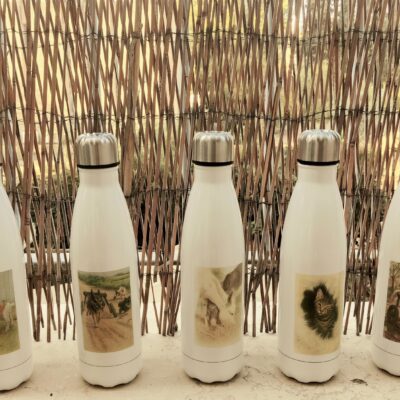 בקבוק תרמי בנפח של 500 מ”ל עם איור של דידי ותמר העיזים ולוגו של חוות קרן אור